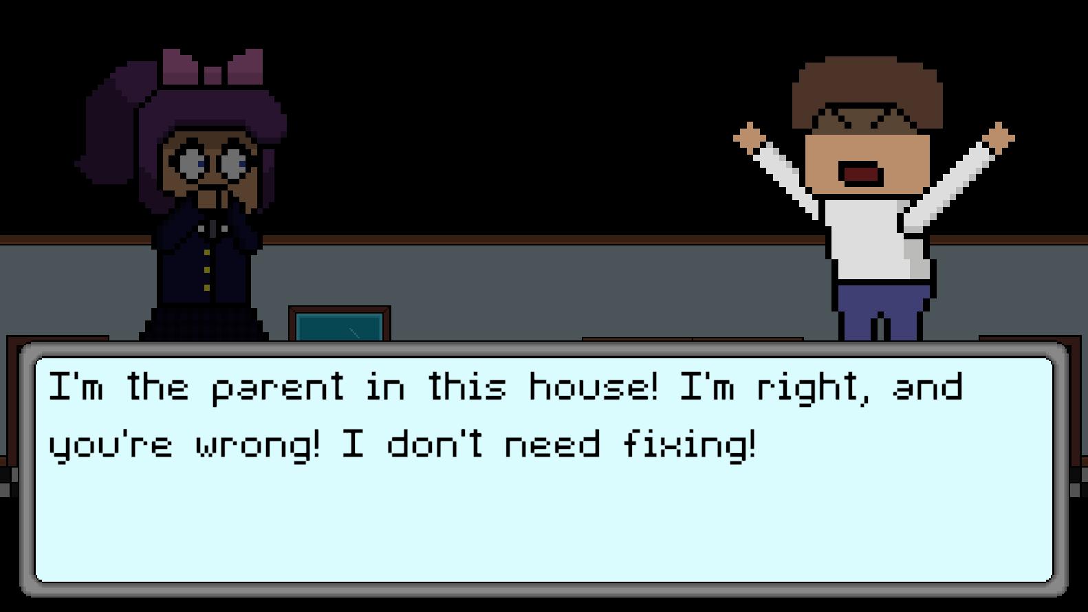 This game was made for the GameName Game Jam, with the theme being "invincible". This theme is represented all throughout the game. The player's father seems invincible, as she cannot get through to him. By strengthening her resolve, she can finally succeed. As she does so, her defense increases, lowering the damage taken by enemies, eventually becoming invincible herself.