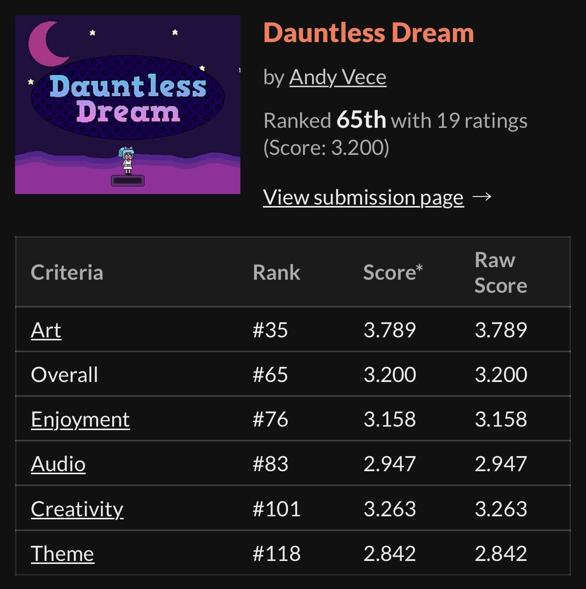 The game placed 65th out of 347 entries. In particular, it ranked 35th in Art and 76th in Enjoyment. I am quite happy with these results.